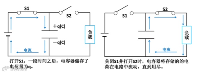 <电容器的工作>电容器储存的电荷在开关S1为OFF,S2为ON的时候,向负载电流流动。