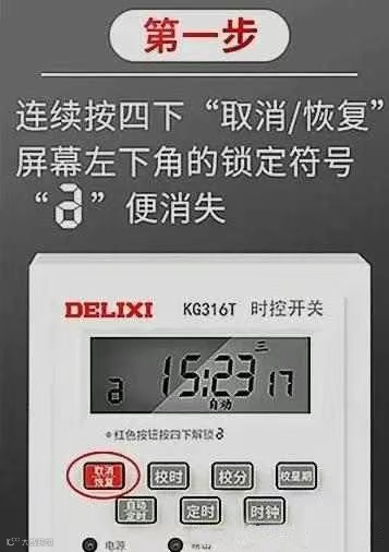 ★操作说明KG316T微电脑时控开关如果锁屏中,按4下取消/恢复键 解锁后方可操作