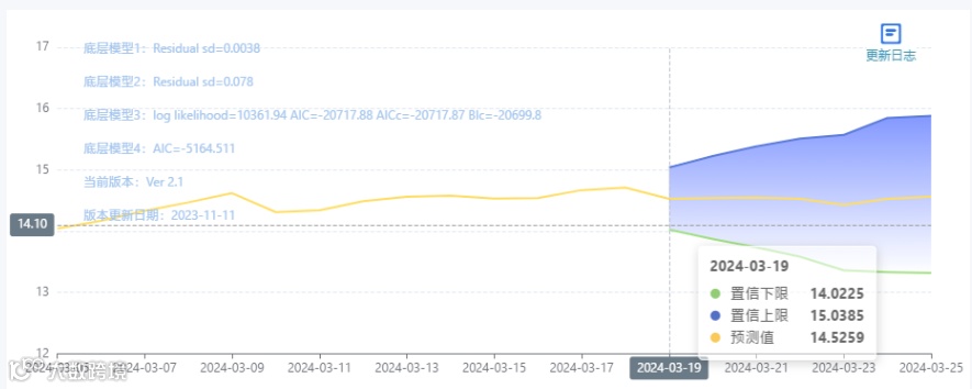 玄田算法是由项目课题组团队原创的非经典逻辑数值聚合理论和不确定性预测方法,构建了基于一致模算子的生猪价格预测模型。该模型采用的聚合函数及一致模相关理论与方法已获得多项国家自然科学基金和省级自然科学资金资助,并获得多项省级自然科学奖奖项。03月19日预测猪价为14.5259,置信区间在14.0225--15.0386之间。03月20日预测猪价为14.5416;03月21日预测猪价为14.5465。