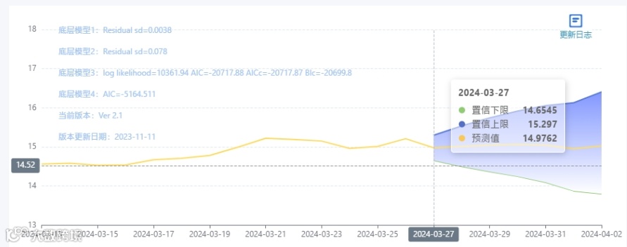 玄田算法是由项目课题组团队原创的非经典逻辑数值聚合理论和不确定性预测方法,构建了基于一致模算子的生猪价格预测模型。该模型采用的聚合函数及一致模相关理论与方法已获得多项国家自然科学基金和省级自然科学资金资助,并获得多项省级自然科学奖奖项。03月26日预测猪价为14.6874,置信区间在14.1835--15.1933之间。03月27日预测猪价为14.7539;03月28日预测猪价为14.6294。