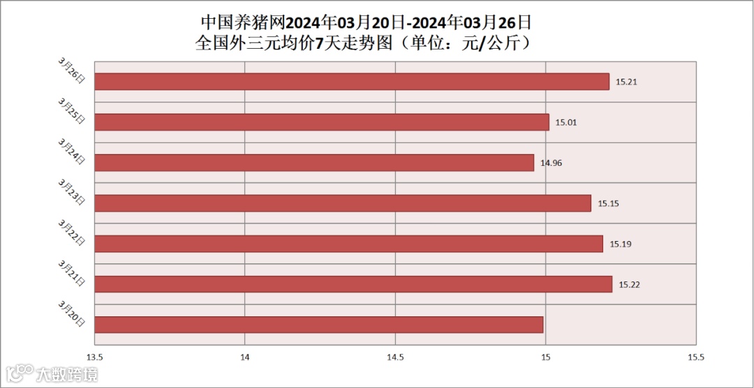 根据“2024年03月26日-中国养猪网生猪(外三元)均价涨跌表”发现,国内外三元生猪价格涨势明显扩大,猪价最高地区宁夏回族自治区为18.19元/公斤,最低地区新疆维吾尔自治区为14.13元/公斤。尽管现阶段依旧处于消费淡季,但是目前市场生猪供应偏紧,屠宰企业压价意愿减弱,叠加养殖端扛价惜售以及二次育肥进场现象,猪价持续保持小幅震荡回温走势。猪价上涨走势逐步突显,近期多地气温回暖,居民出行踏青等活动一定程度上促进消费提振,支撑行情上涨。清明假期将至,屠企有节前备货的需求,开工率或将提升,预计短期内猪价保持小幅回温为主,但涨幅有限。