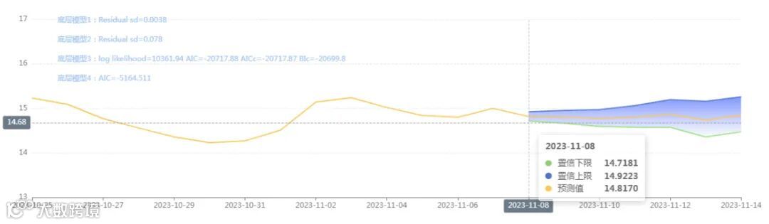 玄田算法是由项目课题组团队原创的非经典逻辑数值聚合理论和不确定性预测方法,构建了基于一致模算子的生猪价格预测模型。该模型采用的聚合函数及一致模相关理论与方法已获得多项国家自然科学基金和省级自然科学资金资助,并获得多项省级自然科学奖奖项。11月08日预测猪价为14.8170,置信区间在14.7181--14.9223之间。11月09日预测猪价为14.8037;11月10日预测猪价为14.7717。