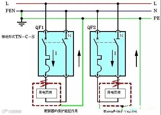 第二:当用电负荷的外露导电部分发生单相接地故障时,故障电流的方向是:断路器N线回路用电负荷的外露导电部分PE线,我们看到,这条路径完全没有线路保护能力。