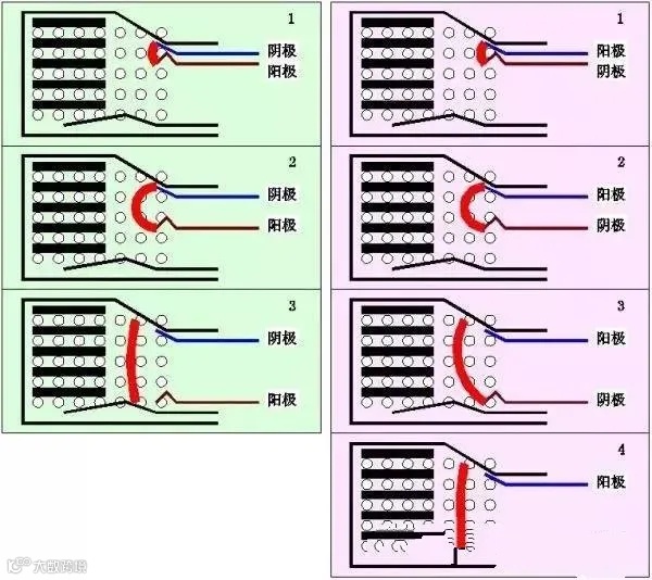 当断路器因为线路短路而跳闸瞬间,这时的电路是有极性的。图中上部是静触头,下部是动触头。图中左侧(绿色部分)表示静触头为负极或者阴极,右侧(红色部分)表示静触头为正极或者阳极。我们来看其中的电弧运动。