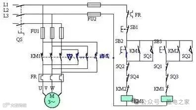 这个电路采用了继电器ka的常开常闭和接触器km1km2常开常闭双互锁结构,安全可靠。