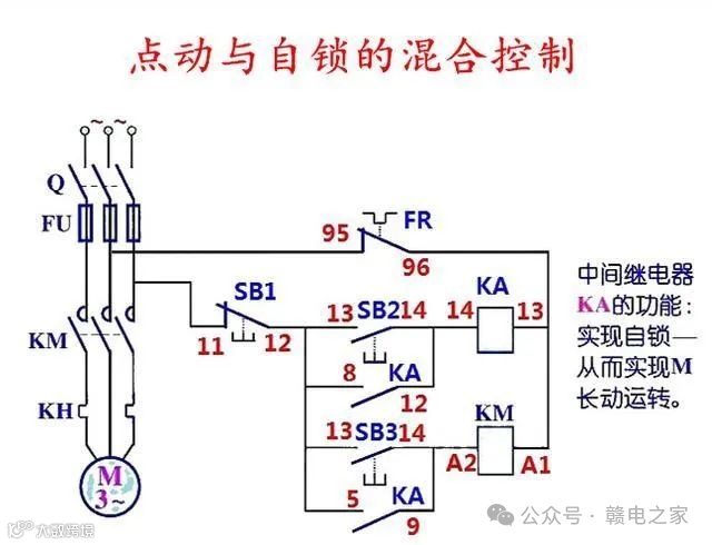 这种控制增加了一个中间继电器,当我们按下SB2时,中间继电器KA形成自锁,同时自身的常开点闭合KM线圈得电,按下SB1时KM和KA的线圈同时失电。按下SB3时接触器KM线圈得电松开SB3时KM线圈失电,点动控制。这种接线控制效果比较好,直接给大家上实物接线图吧。