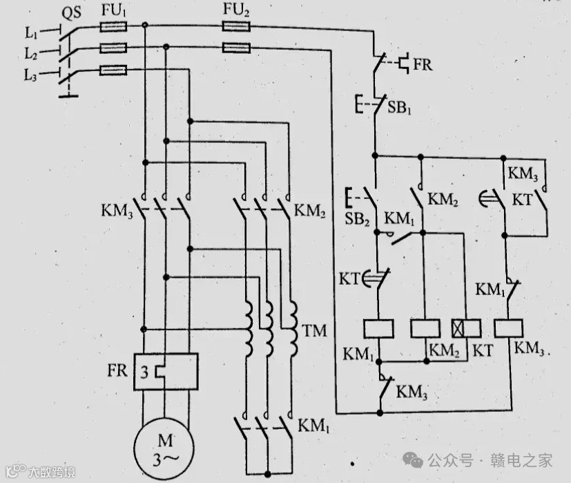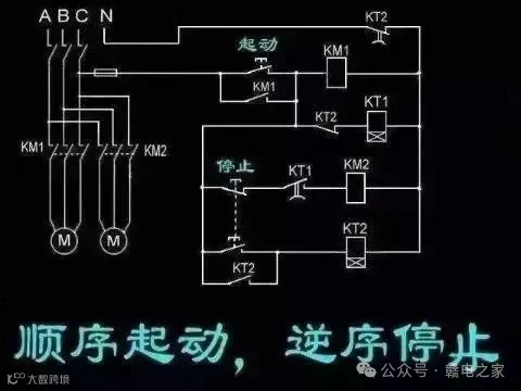 启动按钮按下后km1吸合并保持,KTI1延时后KM2工作;停止按钮按下后,km2先断电停运,经KT22延时后km1断电停运。