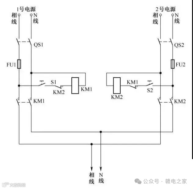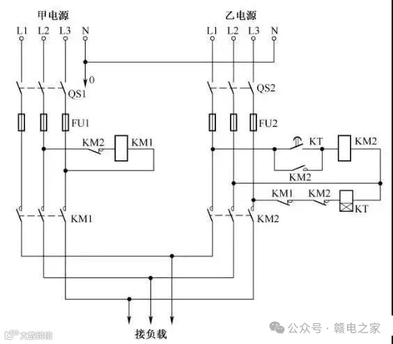双电源切换应用非常广,两个接触器可实现自动切换,主电源的接触器线圈走继电器的常开触点,备用电源的接触器线圈走继电器的常闭触点。