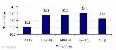 △图2第一次配种时的体重对头三胎的总产仔数影响(N.Williams,2005)