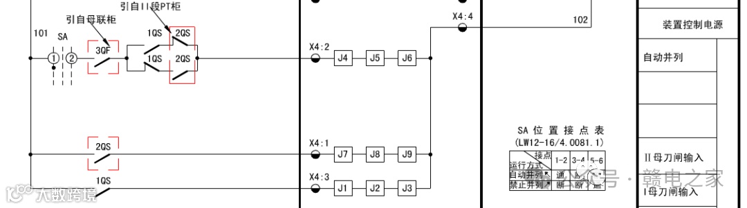 若此时将并列把手(7QK)至于并列位置,1-2接点导通,并列继电器3YQJ1、3YQJ2、3YQJ3得电,对应接点闭合完成两段母线并列。
