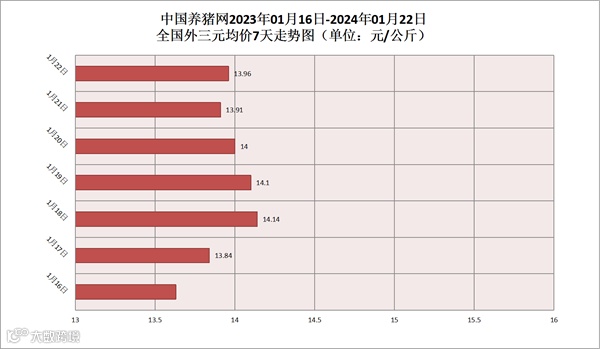 2024年01月22日(星期一),据中国养猪网猪价系统监测,全国外三元均价为13.96元/公斤,猪价较昨日(13.91元/公斤)上涨了0.05元/公斤,较上月(14.50元/公斤)下跌了0.54元/公斤。