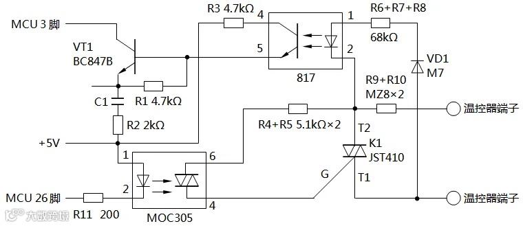 图4是某品牌温控器的单路晶闸管移相触发输出模块的电路原理图,图中驱动输出采用JST410双向晶闸管。817光电耦合器是同步信号检测的隔离器件,它将检测的过零同步信号传送至VT1放大后,送至MCU3脚,MCU根据过零同步信号来确定触发信号,使其按移相要求输出触发脉冲信号。MCU 26脚输出为低电平时,MOC3052光电耦合双向晶闸管驱动器被触发导通,同时又使K1导通,该移相触发驱动信号通过温控器接线端子输出,该信号驱动外接的晶闸管导通从而接通电加热器电源。