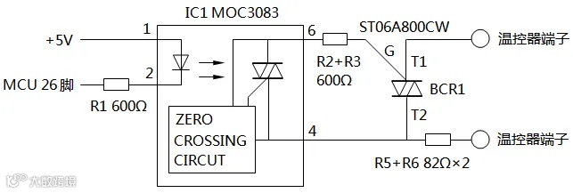 图3是某品牌温控器的单路晶闸管过零触发输出模块的电路原理图,该电路采用了MOC3083光电耦合器。它由砷化镓发光二极管及具有自动过零检测功能的双向晶闸管组成。该光电耦合器有六个引脚,1、2是输入端,4、6是输出端。1、2由温控器的MCU进行控制,当1、2之间有大于5mA的触发电流时,把发光二极管点亮,然后MOC3083中的过零检测电路检测4、6之间的电压,电压出现过零点则触发双向晶闸管,使4、6由断开状态转变为导通状态。当1、2之间的电流消失时,4、6由导通状态转变为断开状态。IC1光电耦合器4、6的通断又控制了BCR1的通断状态,并从温控器接线端子输出过零触发驱动信号。该电路的输出管选择了三象限双向晶闸管,可以不用外接RC缓冲电路。