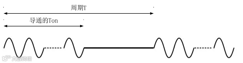 比较常用的PWM调功方式,就是一种过零触发的调功方式。由于过零触发保留了正弦波的完整波形,因此可有效避免谐波对电网产生污染,并且不会降低电网的功率因素。下图是50Hz 电源下的PWM 调功方式的波头示意图。周期T为所设定的PWM周期,而导通的 Ton 为对应占空比下的导通时间。