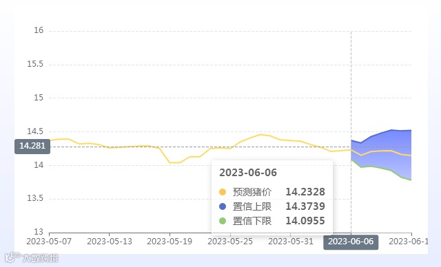 玄田算法是由项目课题组团队原创的非经典逻辑数值聚合理论和不确定性预测方法,构建了基于一致模算子的生猪价格预测模型。该模型采用的聚合函数及一致模相关理论与方法已获得多项国家自然科学基金和省级自然科学资金资助,并获得多项省级自然科学奖奖项。6月6日预测猪价为14.2328,置信区间在14.0955--14.3739之间。6月7日预测猪价为14.1521;6月8日预测猪价为14.2062。