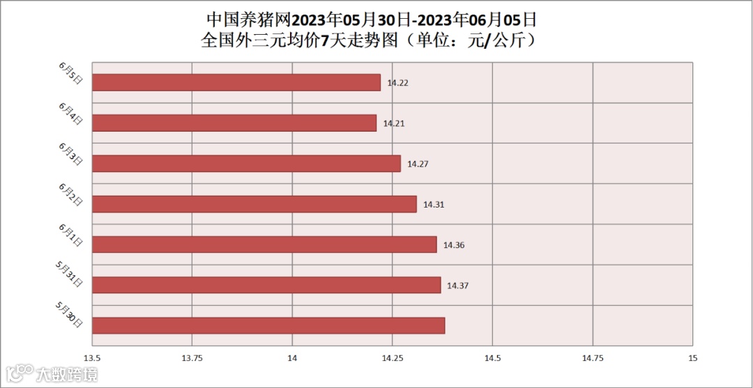2023年06月05日(星期一),据中国养猪网猪价系统监测,全国外三元均价为14.22元/公斤,猪价较昨日(14.23元/公斤)上涨了0.01元/公斤,较上月(14.57元/公斤)下跌了0.35元/公斤。