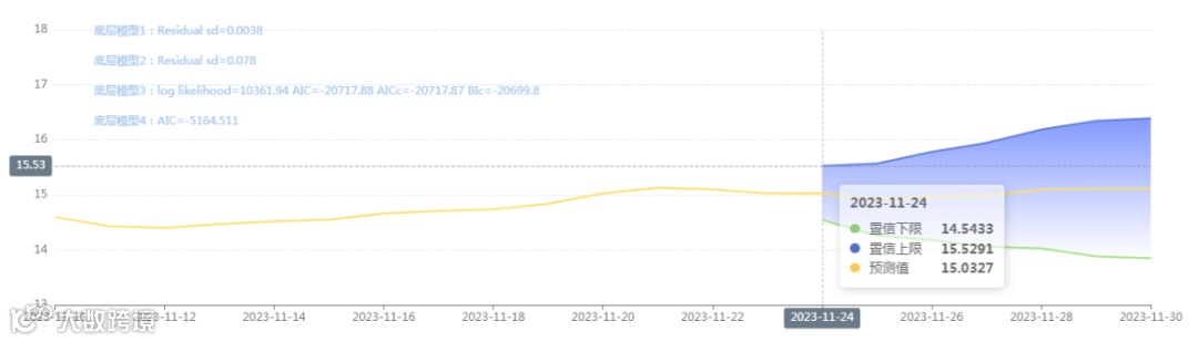 玄田算法是由项目课题组团队原创的非经典逻辑数值聚合理论和不确定性预测方法,构建了基于一致模算子的生猪价格预测模型。该模型采用的聚合函数及一致模相关理论与方法已获得多项国家自然科学基金和省级自然科学资金资助,并获得多项省级自然科学奖奖项。11月24日预测猪价为15.0327,置信区间在14.5433--15.5291之间。11月25日预测猪价为14.9095;11月26日预测猪价为14.9713。