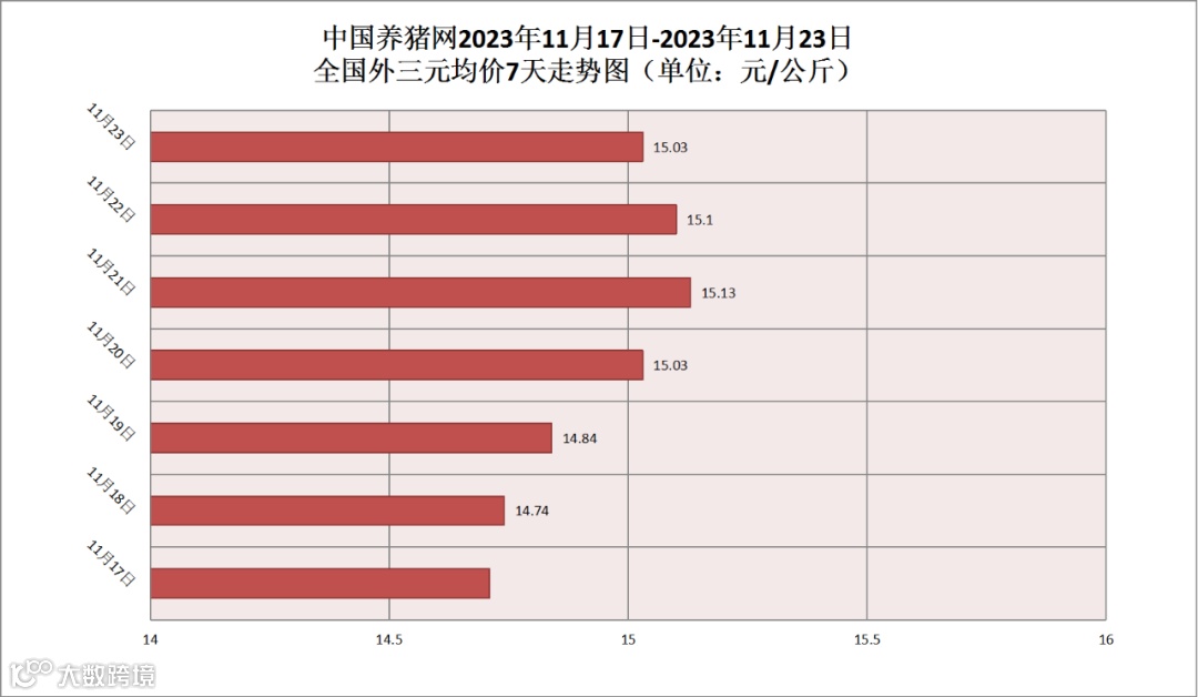 2023年11月23日(星期四),据中国养猪网猪价系统监测,全国外三元均价为15.03元/公斤,猪价较昨日(15.10元/公斤)下跌了0.07元/公斤,较上月(15.19元/公斤)下跌了0.16元/公斤。