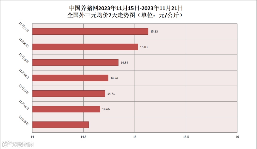 2023年11月21日(星期二),据中国养猪网猪价系统监测,全国外三元均价为15.13元/公斤,猪价较昨日(15.03元/公斤)上涨了0.10元/公斤,较上月(15.61元/公斤)下跌了0.48元/公斤。