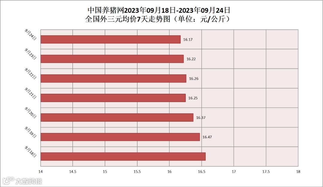 2023年09月24日(星期日),据中国养猪网猪价系统监测,全国外三元均价为16.17元/公斤,猪价较昨日(16.22元/公斤)下跌了0.05元/公斤,较上月(17.19元/公斤)下跌了1.02元/公斤。