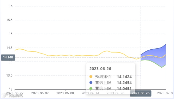 玄田算法是由项目课题组团队原创的非经典逻辑数值聚合理论和不确定性预测方法,构建了基于一致模算子的生猪价格预测模型。该模型采用的聚合函数及一致模相关理论与方法已获得多项国家自然科学基金和省级自然科学资金资助,并获得多项省级自然科学奖奖项。6月26日预测猪价为14.1424,置信区间在14.0451--14.2454之间。6月27日预测猪价为14.2006;6月28日预测猪价为14.2266。