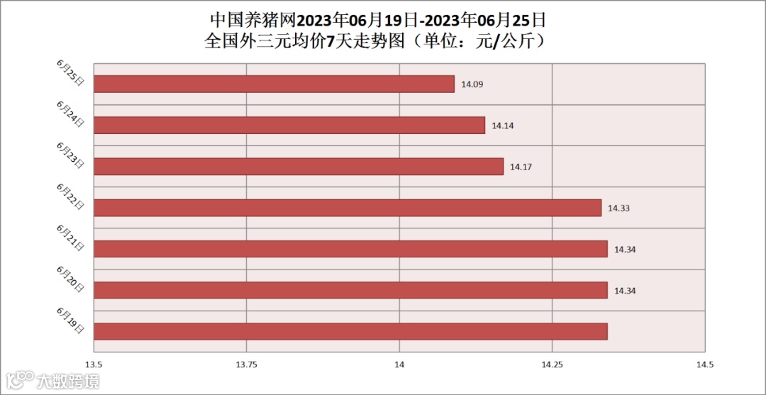 2023年06月25日(星期日),据中国养猪网猪价系统监测,全国外三元均价为14.09元/公斤,猪价较昨日(14.14元/公斤)下跌了0.05元/公斤,较上月(14.25元/公斤)下跌了0.16元/公斤。