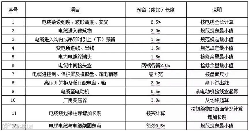 注:电缆附加及预留的长度是电缆敷设长度的组成部分,应计入电缆长度工程量之内。也就是说电缆敷设弛度、波形弯度、交叉的附加长度应按设计图示水平和垂直敷设长度加各预留长度之和为计算基础。