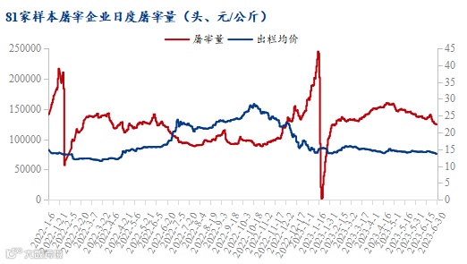 需求端看,据Mysteel农产品数据统计,截止到6月30日81家样本屠宰企业日度屠宰量为,环比,同比,整体2023年屠宰量水平高于去年同期,体现今年猪肉消费相对好于去年,但宰量的提升还得益于当前低位的猪价、供给的增量,从当前整体市场消费情况及消费意愿看,消费的回暖程度并不能抵消供给带来的巨大压力,从而使得猪价出现适度上涨行情。