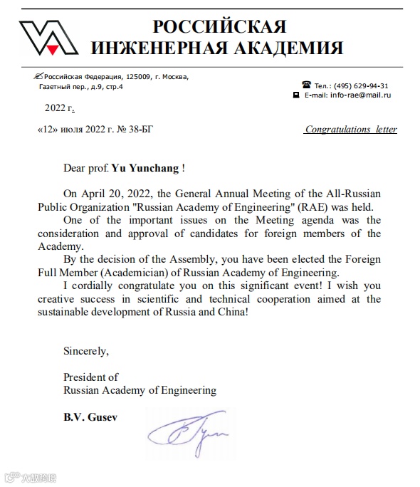 俄罗斯工程院古谢夫院长向中国入选单位和个人发出贺信,祝贺其成为俄罗斯工程院会员单位和俄罗斯工程院外籍院士。刘雪松收到来自俄罗斯工程院 ( Russian Academy of Engineering, RAE ) B.V.Gusev院长的贺信。Gusev院长祝贺浙江大学求是特聘教授、泽达易盛(天津)科技股份有限公司首席科学家刘雪松当选为俄罗斯工程院外籍院士,并希望他在中俄两国可持续发展的科学与技术合作中取得创造性的成功。