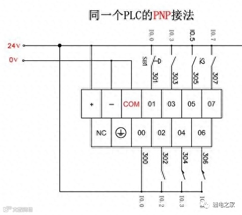 公共端是0V时,PLC的接法是PNP,这时PLC只能接收PNP传感器的信号,对于NPN传感器没有任何反应。而对于干结点传感器,一般来说只需要将传感器的公共端接成24V,就可以连接到PNP的PLC上。