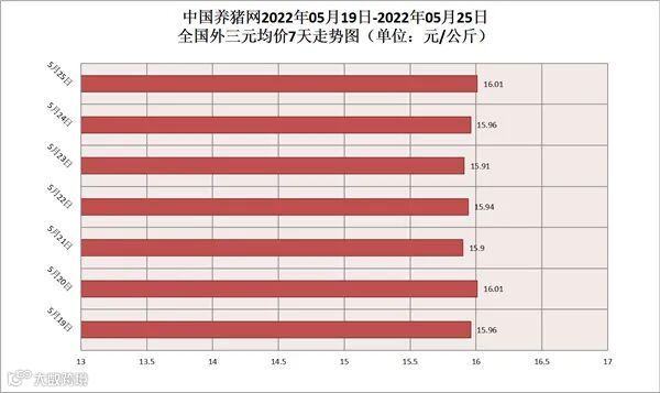 2022年05月25日(星期三),据中国养猪网猪价系统监测,全国外三元均价为16.01元/公斤,猪价较昨日(15.96元/公斤)上涨了0.05元/公斤,较上月(14.65元/公斤)上涨了1.36元/公斤。