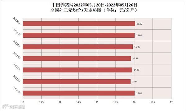 2022年05月26日(星期四),据中国养猪网猪价系统监测,全国外三元均价为16.02元/公斤,猪价较昨日(16.01元/公斤)上涨了0.01元/公斤,较上月(14.75元/公斤)上涨了1.27元/公斤。