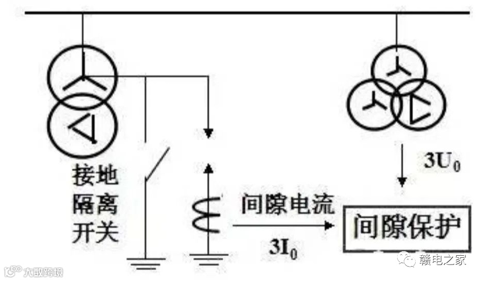 如图在变压器中性点对地之间安装一个击穿间隙。当接地隔离开关闭合,变压器直接接地,投入零序过流保护。当接地隔离开关断开时,变压器经间隙接地,投入间隙保护。