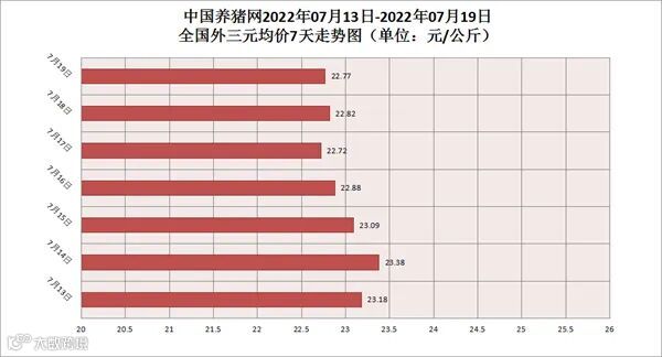 2022年07月19日(星期二),据中国养猪网猪价系统监测,全国外三元均价为22.77元/公斤,猪价较昨日(11.39元/公斤)下跌了0.05元/公斤,较上月(16.68元/公斤)上涨了6.09元/公斤。