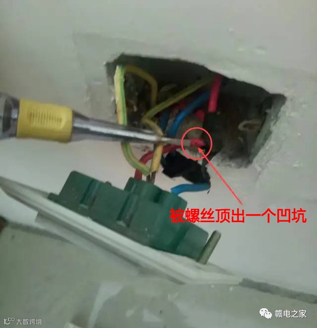 经过反复观察暗盒与电线,发现火线绝缘层上有一个小凹坑,不仔细观察还看不出来。根据凹坑的形状和位置,应该是固定插座的螺丝顶出来的。就是这个凹坑导致绝缘层变薄了,另外绝缘层的绝缘性能不好,虽然没有破皮,但是会有一些漏电的问题。所以火线对地漏电非常轻微,一天几个小时跳一次。