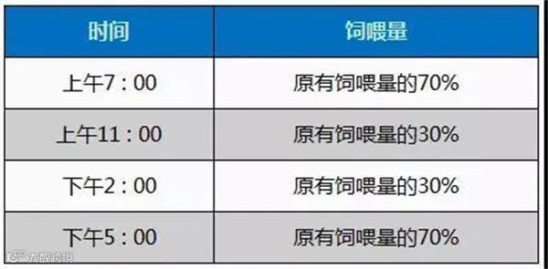 每天两顿改为四顿,饲喂量控制详见下表操作