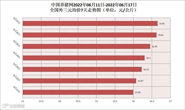 2022年06月17日(星期五),据中国养猪网猪价系统监测,全国外三元均价为16.65元/公斤,猪价较昨日(16.62元/公斤)上涨了0.03元/公斤,较上月(15.7元/公斤)上涨了0.95元/公斤。