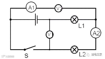 第六步:根据原则四,知道电压表V2处断开,所以没有电流从A1流过,示数为零;根据滑移法知道V1和电源并联,测电源两端电压。V2和L2并联,测L2两端电压。