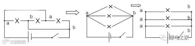 ☀第十:如果导线上(节点之间)没有用电器(开关,电流表除外),那么导线上的各点可以看做是一个点,可以任意合并、分开、增减。(此法又称节点法)例如:
