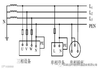 (1)、在TN-C系统中,将PE线和N线的功能综合起来,由一根称为PEN线的导体同时承担两者的功能。在用电设备处,PEN线既连接到负荷中性点上,又连接到设备外露的可导电部分。由于它所固有的技术上的种种弊端,现在已很少采用,尤其是在民用配电中,已基本上不允许采用TN-C系统。