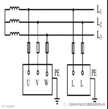 (1)、TN-S系统中性线N与TT系统相同。与TT系统不同的是,用电设备外露可导电部分通过PE线连接到电源中性点,与系统中性点共用接地体,而不是连接到自己专用的接地体,中性线(N线)和保护线(PE线)是分开的。