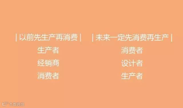 当你有一个想法时,你可以先表达出来,然后在平台上进行展示(这样的平台会越来越多),然后吸引喜欢的人去下单,拿到订单后可以找工厂生产(不用担心量太少,今后的生产一定会精细化和定制化),然后再送到消费者手里。