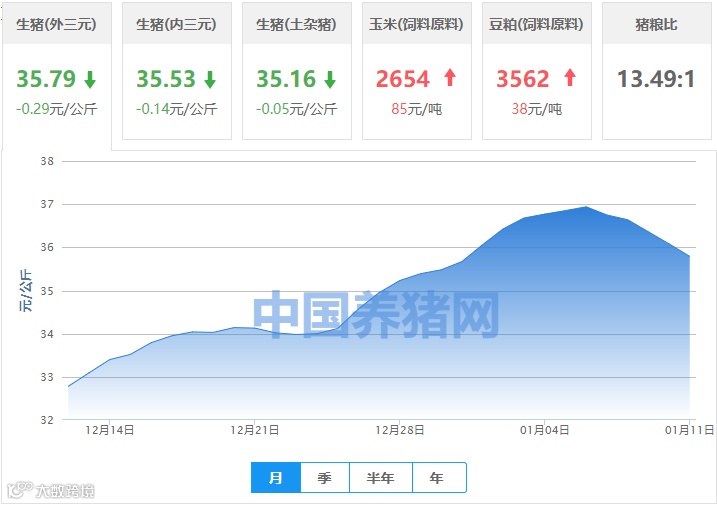 | 地区名称 | 外三元(元/公斤) | 内三元(元/公斤) | 土杂猪(元/公斤) | 玉米(元/吨) | 豆粕(元/吨) |
