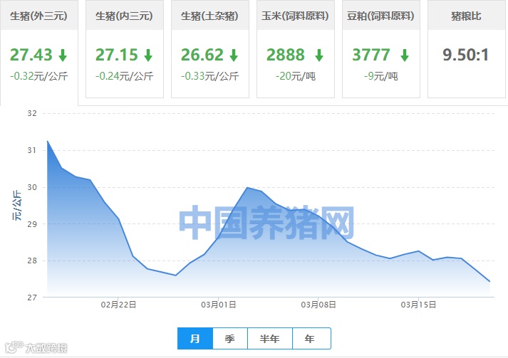 | 地区名称 | 外三元(元/公斤) | 内三元(元/公斤) | 土杂猪(元/公斤) | 玉米(元/吨) | 豆粕(元/吨) |
