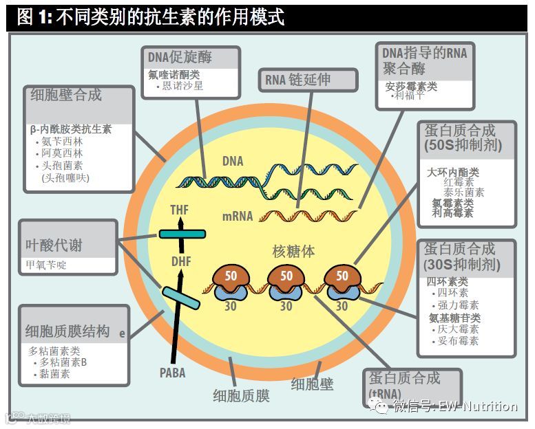 为探讨这个问题,对不同类别的抗生素进行了试验,其中包括细胞壁合成抑制剂如青霉素和头孢菌素,干扰细菌细胞膜完整性的多肽类抗生素如多粘菌素,蛋白质合成抑制剂如四环类素、氨基糖苷类、酚类、大环内酯类和林可酰胺类,促旋酶抑制剂如氟喹诺酮类的恩诺沙星,以及RNA合成抑制剂如安沙霉素类。(见图1)