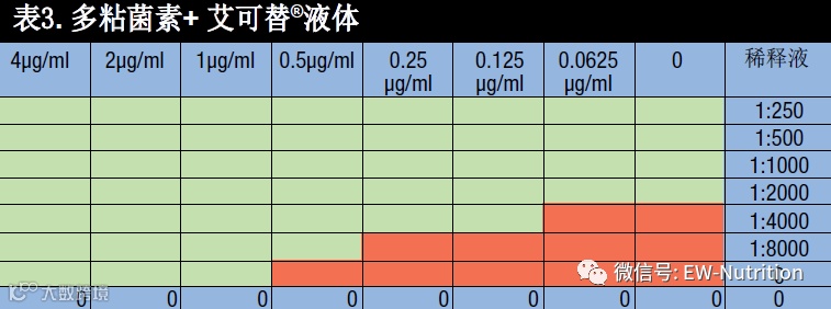 第3张图表显示了对连续稀释液施加多粘菌素的效果评估,可以看到两种产品相互之间的影响(呈台阶状)。例如:浓度为0.5 μg / ml时,抗生素不显示任何效果。同样,植物精华素液体(艾可替液体®)在浓度1:8000时也不显示任何效果。但由于两者的协同作用,将0.5μg/ ml的抗生素和1: 8000的植物精华素液体(艾可替液体®)结合使用时,它们在较低的剂量下就发挥了杀菌作用。