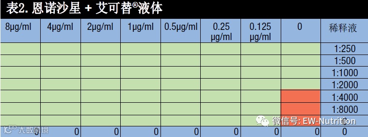 如果对该大肠杆菌菌株施加恩诺沙星,则可看到另一番景象(表2)。这些细菌对该抗生素治疗非常敏感,从最低浓度开始就可以看到杀菌效果。正如表1已显示的,艾可替液体®从1:2000或更低稀释度就具有杀菌作用。还可以证明,植物精华素液体(艾可替液体®)不会对抗生素产生不利影响,因为即使增加其剂量也不会损害抗生素的功效。