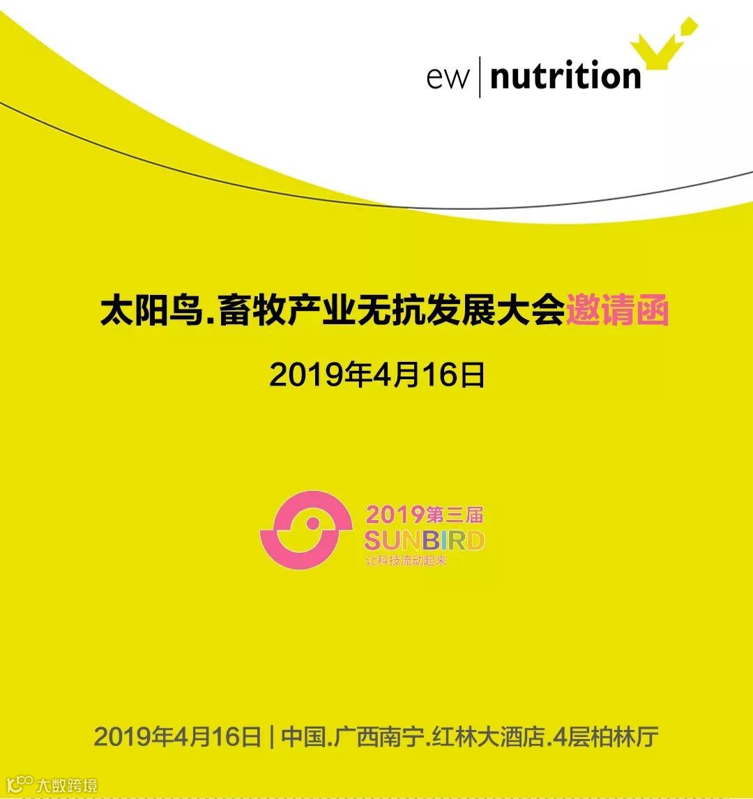 第三届太阳鸟•畜牧产业无抗发展大会将于2019年4月16日在南宁红林大酒店隆重举行。德国EW-Nutrition作为降低抗生素耐药性风险的积极推行者应邀参加大会,同专家学者共同就“减抗、替抗、无抗实践中的研究及对应措施”等问题进行交流。