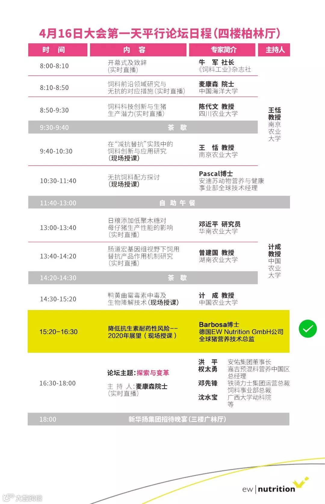 德国EW-Nutrition公司邀请了全球猪营养技术总监Barbosa博士,将在现场做主题为《降低抗生素耐药性风险--2020年展望》的专题讲座。相信一定会给关注无抗养殖技术及未来产业发展方向的您带来全新的理念和实用信息。期待您的光临!