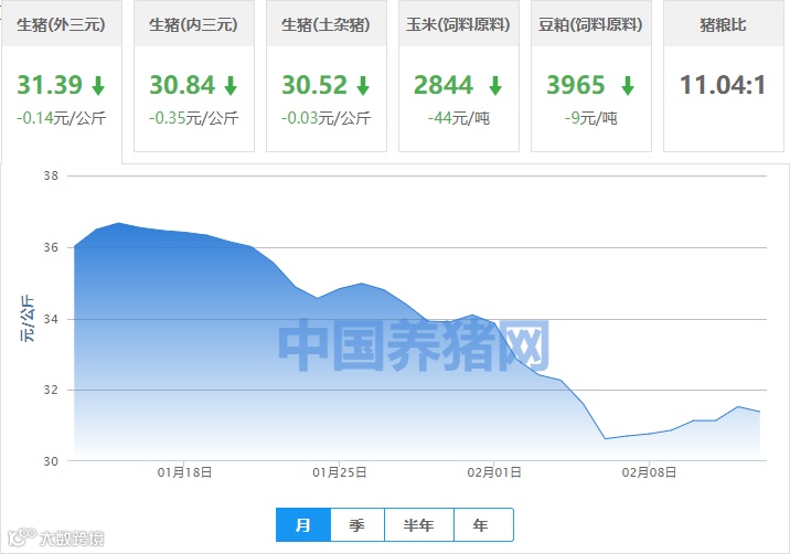 | 地区名称 | 外三元(元/公斤) | 内三元(元/公斤) | 土杂猪(元/公斤) | 玉米(元/吨) | 豆粕(元/吨) |